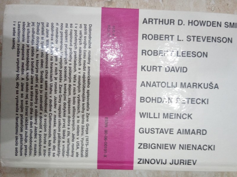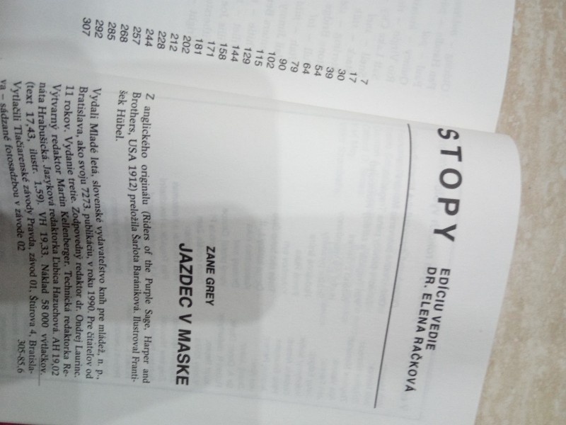 Predám knihu Jazdec v maske z edície Stopy. Pošlem poštou, alebo osobný odber v NR/BA. Dobrodružný román, odohrávajúci sa pri hraniciach Utahu, kde žije krásna Jane, ktorá si znepriatelí celú dedinu. Zlodeji dobytka, ku ktorým patrí aj záhadný jazdec v maske, jej odháňajú stáda a Jane sa stáva zo dňa na deň chudobnejšou. Musí teda bojovať a vymyslieť niečo, aby sa vymanila z obludnej moci fanatizmu...