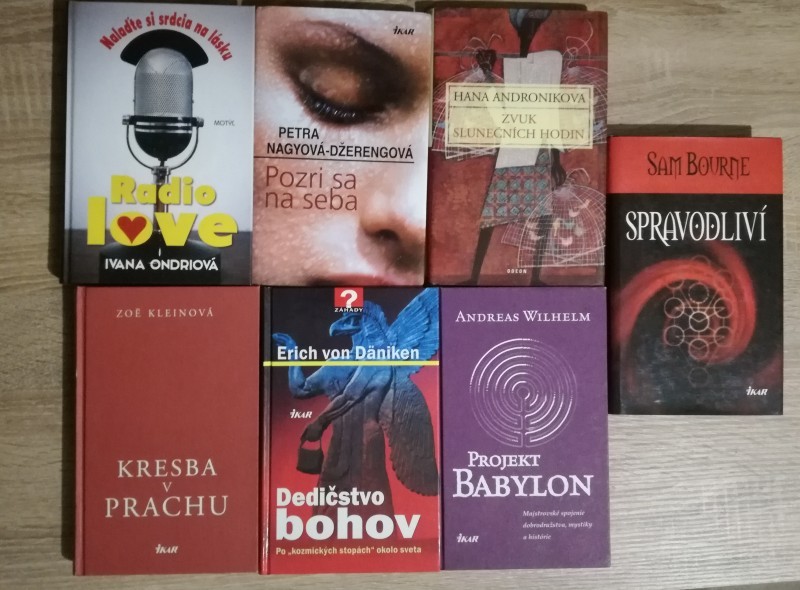 Ponúkam na predaj tieto knihy: Ivana Ondriová - Radio love - 4€, Petra Nagyová-Džerengová - Pozri sa na seba - 4€, Hana Androniková - Zvuk slunečních hodin - 4€, Zoe Kleinová - Kresba v prachu - 3€ (bez prebalu), Erich von Daniken - Dedičstvo bohov - 4€, Andreas Wilhelm - Projekt Babylon - 3€ (bez prebalu), Sam Bourne - Spravodliví - 4€. Kupujúci hradí aj poštovné. Posielam aj na dobierku.