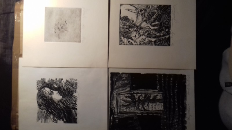 4 volné grafické listy - Techniky drevoryt,lept. 1.Igor RUMANSKÝ bez názvu 1975 drevoryt číslo 38/50 Rozmer tlače 11x11cm Rozmer listu 22x21cm podpis vpravo...Cena 70 euro 2.Jana KISELOVÁ Vták 1977 lept číslo 57/80 RT 9x8,5cm RL 21x21cm podpis vpravo Cena 70 euro 3.Kamila ŠTANCLOVÁ Blany oceánov 1973 drevory t číslo 38/50 RT 19x14cm RL 22x21cm podpis vpravo. Cena 80 euro 4.Marian MINAROVIČ Cesty 1978 drevoryt číslo 17/50 RT 12x10cm RL 21x21cm podpis vpravo. Cena 70 euro